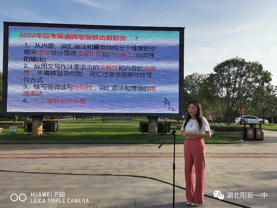 随后,高三年级英语备课组组长罗佳老师跟全体同学们分享了关于一轮复习备考的培训成果,重点分析了英语书面表达的重要性,讲解了如何做好英语书面表达,指出了2022年高考英语阅卷反映出的趋势,细致分析了影响高考英语书面表达扣分的因素和得高分条件,并现场教同学们如何快速学会“衡水体”英语书写。她最后还告诉同学们,任何进步永远是焚膏继晷的决心、破釜沉舟的勇气!