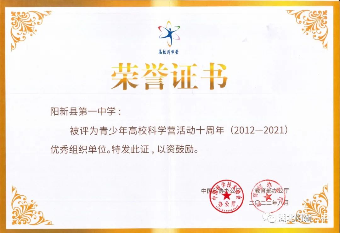 自2013年至2022年,阳新一中连续10年精心组织、认真选拔优秀学生参加高校科学营活动。我校学生在高校科学营活动中表现突出,共有39位同学被评为“优秀营员”,高校科学营活动让阳新一中这个县域高中的学子视野更加开阔,志向更加远大。倪志鹏、张迅、冯欣悦、倪凌杰、石夏君、陈圣涛、朱封浩等一大批同学被清华大学、北京大学、香港中文大学、上海交大、浙江大学等985、211、双一流高校录取。