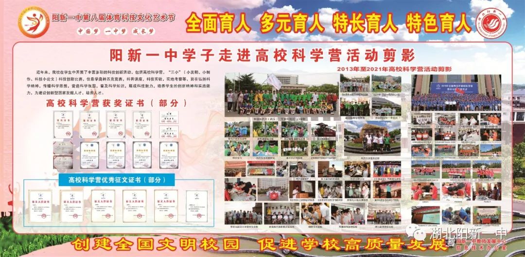 "科技兴则民族兴,科技强则国家强。"为引导阳新一中学子心怀科技梦想,树立创新志向,阳新一中坚持“全面发展、多元发展、特长发展、特色发展”的育人理念,深入推进科普教育,提高师生科学素养,助力学生多元发展。通过组织丰富多彩的科普活动,参加青少年高校科学营等方式,进一步丰富了“科技一中”的内涵,让“科技一中”成为了一张闪亮的名片。