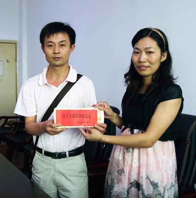 623上午8时许,我校校长、党总支书记赵立中专程来到县实验中学,将凝聚着阳新一中师生真情的10000余元捐款,送到县实验中学教师刘合勇老师手中,以帮助他身患白血病的5岁的儿子刘琛早日闯过生命旅途中的难关。