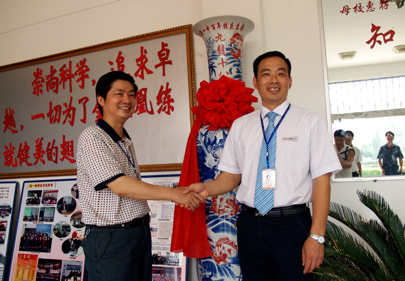 江西金太阳教育研究公司领导专程赶来赠送瓷瓶 ,上图为一中校长赵立中与该公司领导合影