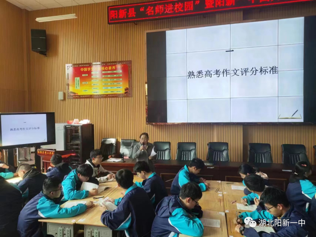 此次活动分为两部分。首先,吴洪涛老师为阳新一中高三学子传经送宝,带来了《高考作文升格之法》的专题讲课。吴老师结合高考评分标准,带领学生研读评分细则,熟悉高考评分准则,对比示范作文,总结高分作文的特点,如有事例论证充分、语言表达准确生动、有感染力、书写工整美观、有适当的辩证论证等特点。吴老师以其丰富的备考经历,扎实的备考功底展示了高考审题的重要性,令与会人员受益匪浅。