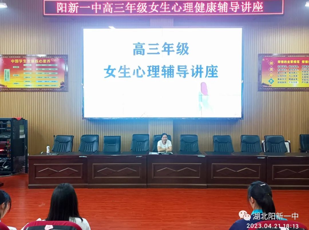 “每个人,都必定出发于他的少年时。执着追梦的过程本身就是最值得被记住的时光。”在紧张的复习备考之际,为帮助高三女生正确认识情绪,发现自我,调整状态,4月21日晚,阳光心理课程中心姜玉梅老师在明德楼报告厅为全体高三女生开展了《以梦为马,不负韶华》高三年级女生心理辅导讲座。高三年级近700名女生分两场聆听讲座,阳新一中副校长徐美姝和女工委主任邓丽娟全程参加讲座。徐美姝副校长以女生的“四自”教育开场,她说“长得漂亮是优势,活得漂亮才是本事”,每位女生都要活得漂亮,这是学校对全体女生殷切的期望。