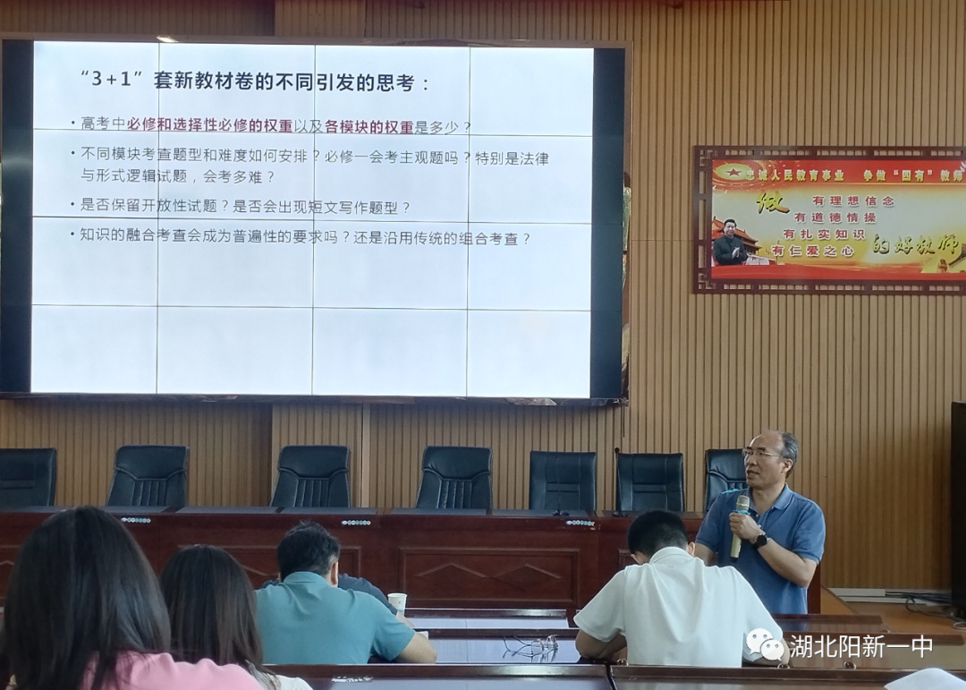 2023年5月18日下午,为进一步推动高考复习,指导学生更好冲刺高考,由阳新教科院组织,阳新一中承办的“名师进校园”活动在明道楼报告厅进行。本次活动主讲人是武汉市教科院张祖涛老师。县教科院副院长郑宏图、阳新一中全体政治老师、县内兄弟高中政治教师代表参加活动。活动由阳新一中高三政治组组长阮家浬主持。