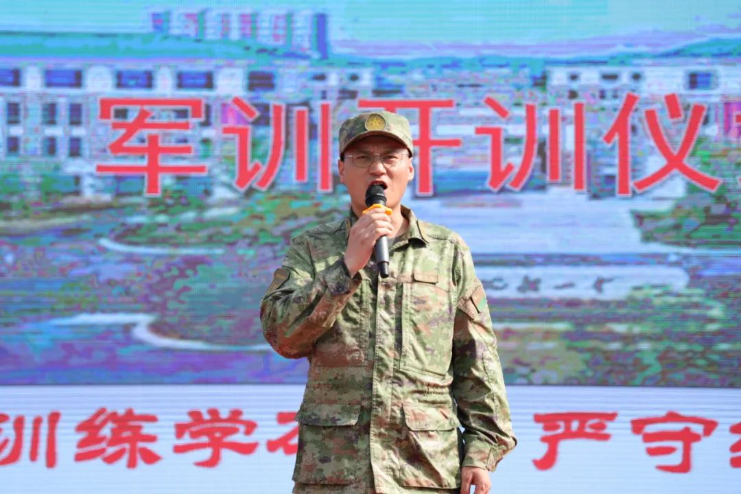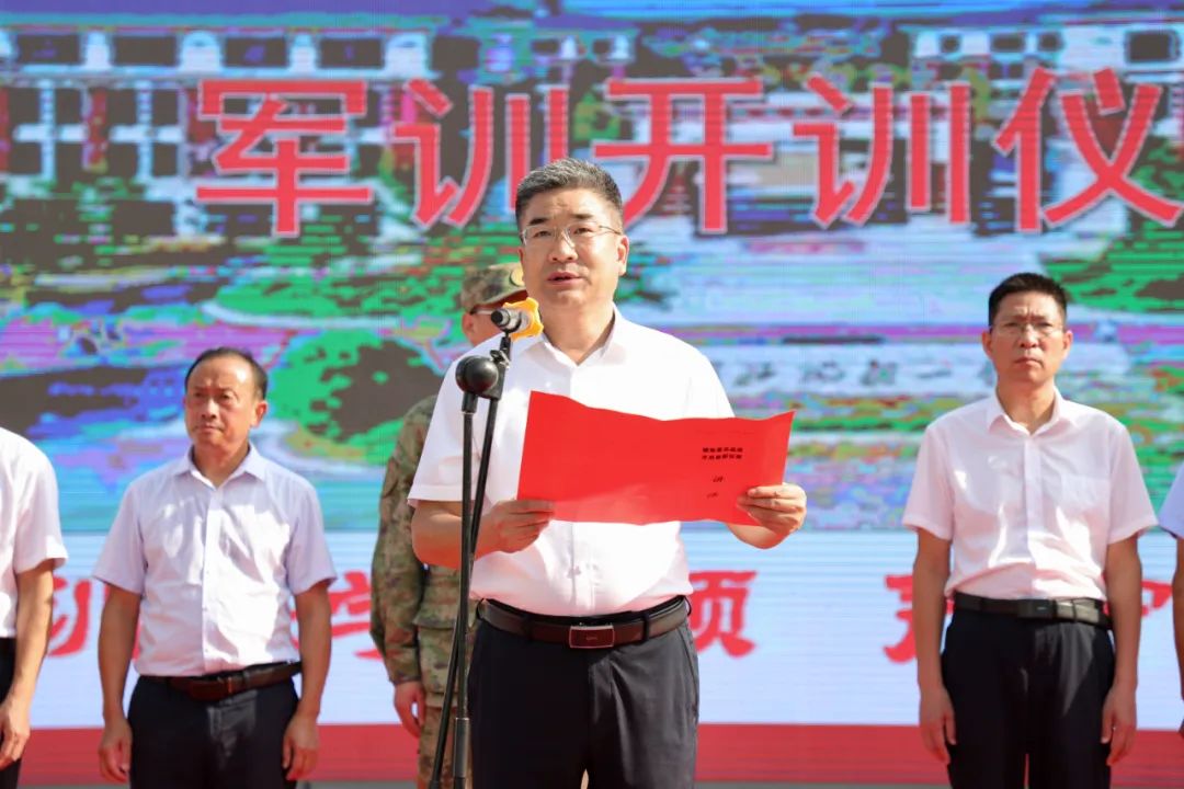 校党委书记明道树作《锤炼意志品质,开启崭新征程》的主题讲话:他首先对武装部全体教官的到来表示了热烈欢迎和感谢,同时以“”三个”新”字表达了全体同学的期望。第一个“新”是祝福新学子,欢迎新同学!他对注入新鲜血液的新同学表达了热烈祝贺和欢迎。第二个“新”是认知新学校,融入新集体。明书记介绍了阳新一中的悠久历史和文化底蕴,分享了2023年高考取得的成绩,并以此激励同学们,三年后,2026届高考将突破千人大关,勉励同学们尽快适应新环境,迅速成长,承载一中荣光,再续一中辉煌。第三个“新”是认识新时代,树立新目标。勉励同学们以军训为起点迈好高中第一步,开启高中三年高质量的学习生活,以优异的成绩回报母校、回馈社会,建功立业新时代。最后明书记对为期一周的军训提出了三点要求:一是严明纪律,接受考验,做遵规守纪一中人;二是积极参与,团队合作,做团结拼搏的一中人;三是勇于担当,强化责任,做志存高远的一中人。他强调:“同学们要用实际行动证明自己的价值,在练兵场上锤炼强壮体魄,在课堂内外学习知识本领,将个人志向与时代呼唤结合在一起,勇立潮头,担起时代责任,追求梦想,为中华民族的伟大复兴贡献自己的力量。”