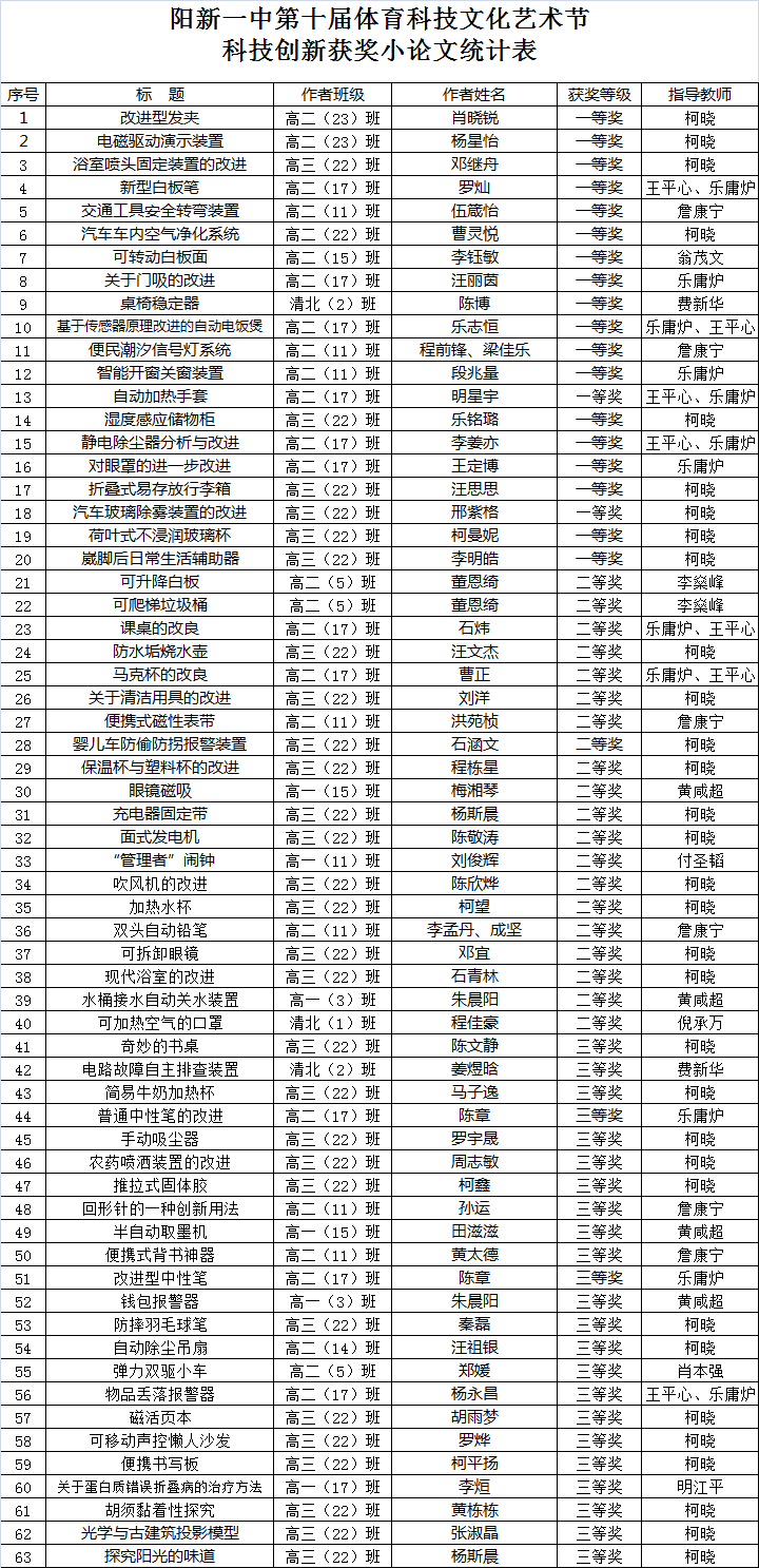 学生经过长时间的酝酿创作,共提交科技小论文70多篇。经学校评审小组评审,产生科技小论文一等奖20篇,二等奖20篇,三等奖23篇。
