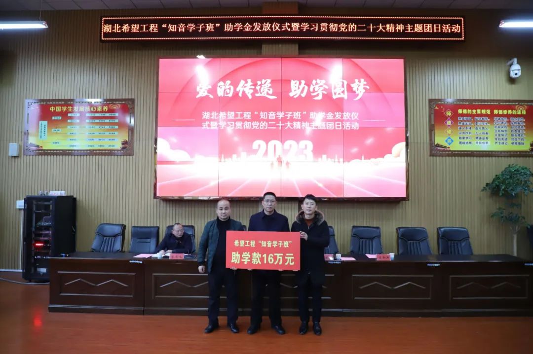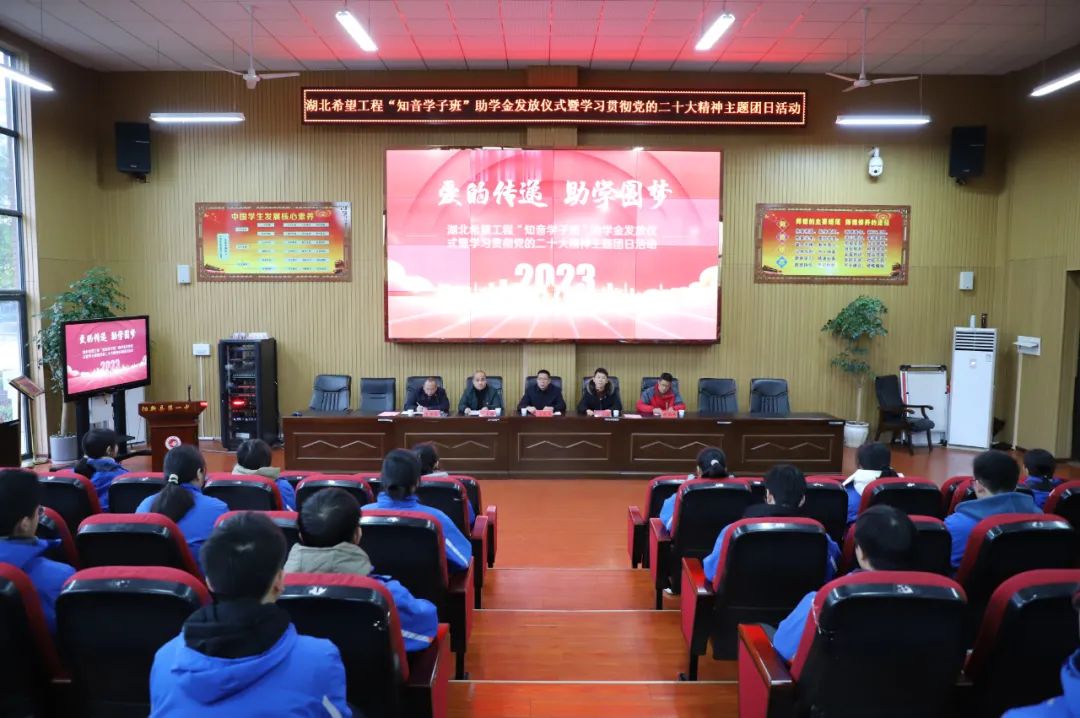 12月20日15:00,阳新一中隆重举行湖北希望工程“知音学子班”助学金发放仪式。团县委副书记赵文山、烟草局纪检组长赵亚雄、阳新一中校长方长风、校委委员李雁鸣以及50余名师生参加活动。