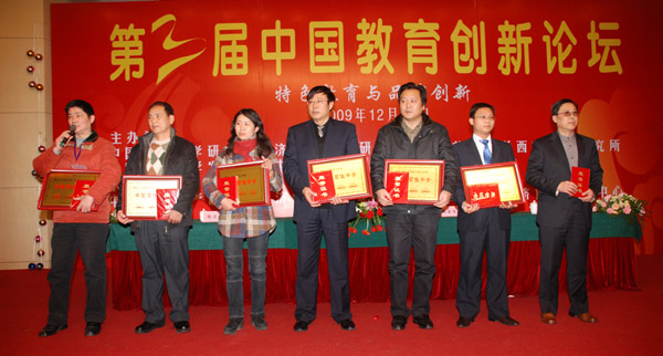 一:赵立中校长在领奖台上代表获奖单位发言