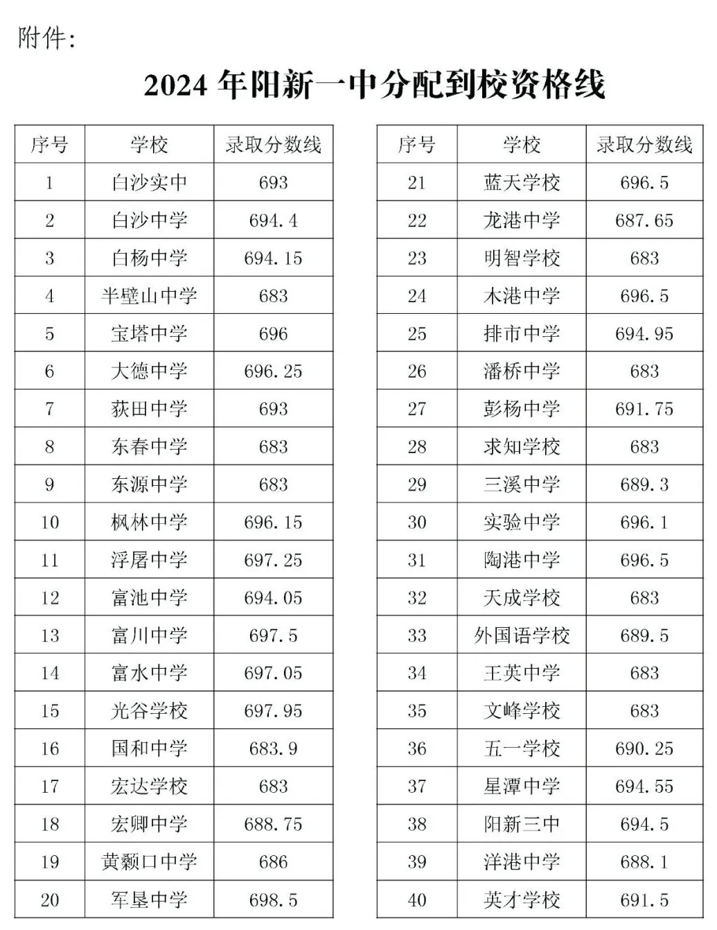 2.分配生:执行一校一线(见附件);阳新一中最低录取控制线683分。若阳新一中有剩余计划,则在本县683分及以上考生中从高分到低分录满为止。