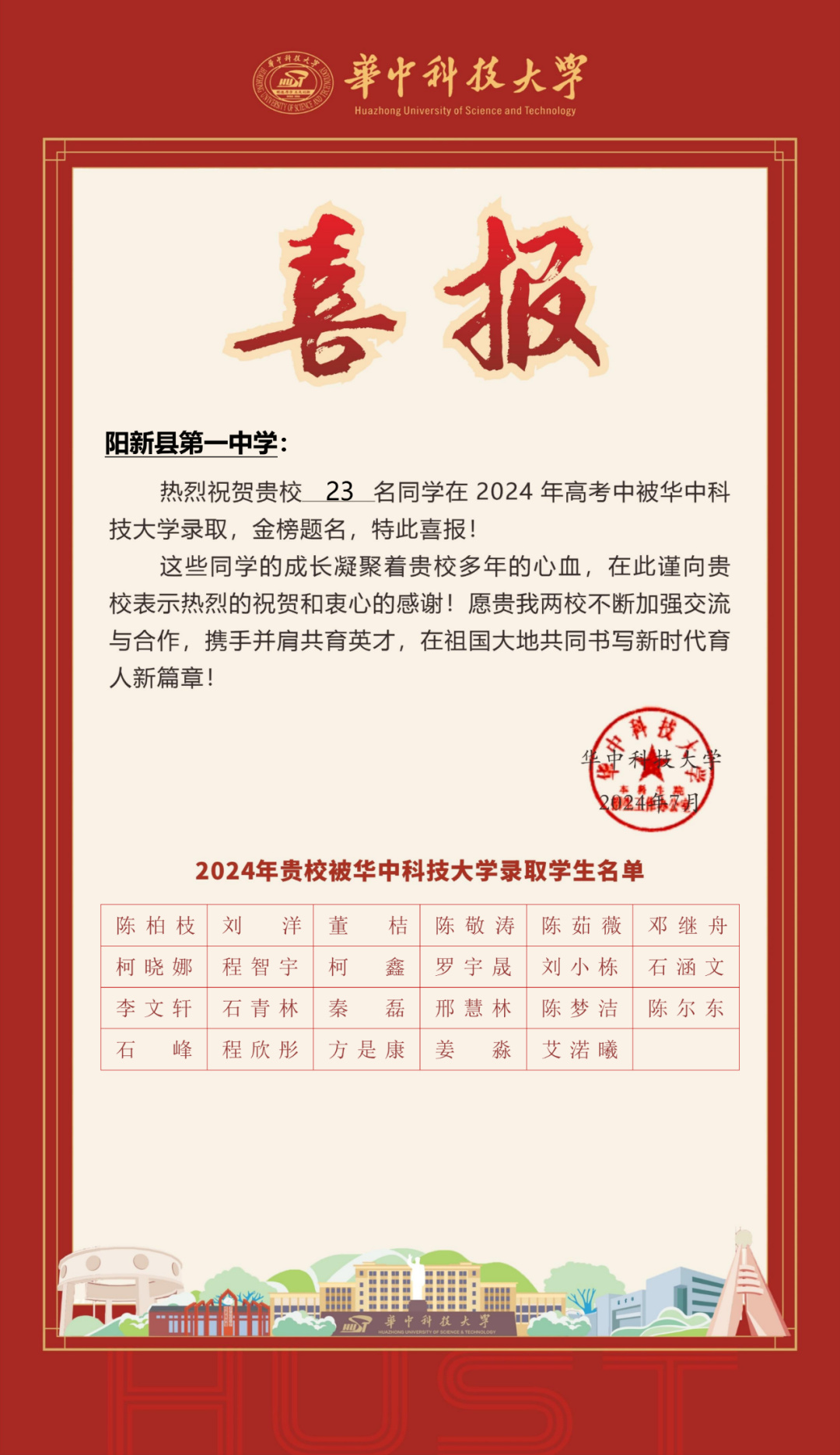 近日,我校收到华中科技大学发来的喜报。祝贺我校陈柏枝等23名学子被录取。