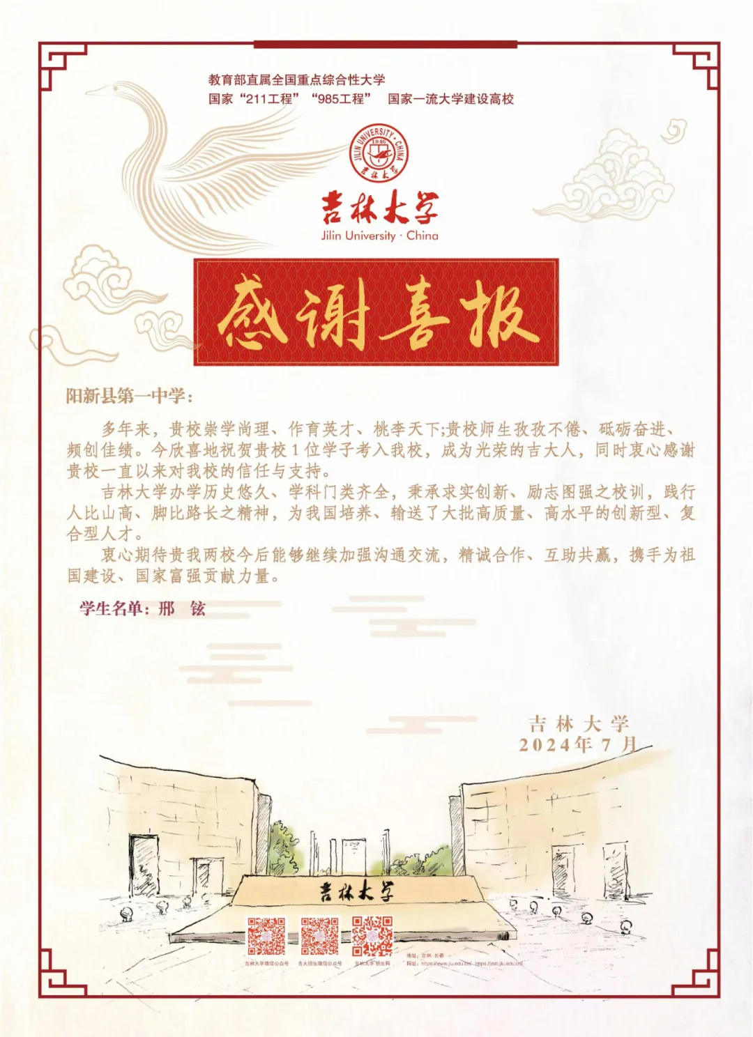 近日,我校收到华南理工大学、吉林大学、中国地质大学发来的喜报。祝贺我校邢铉等多名学子被录取。