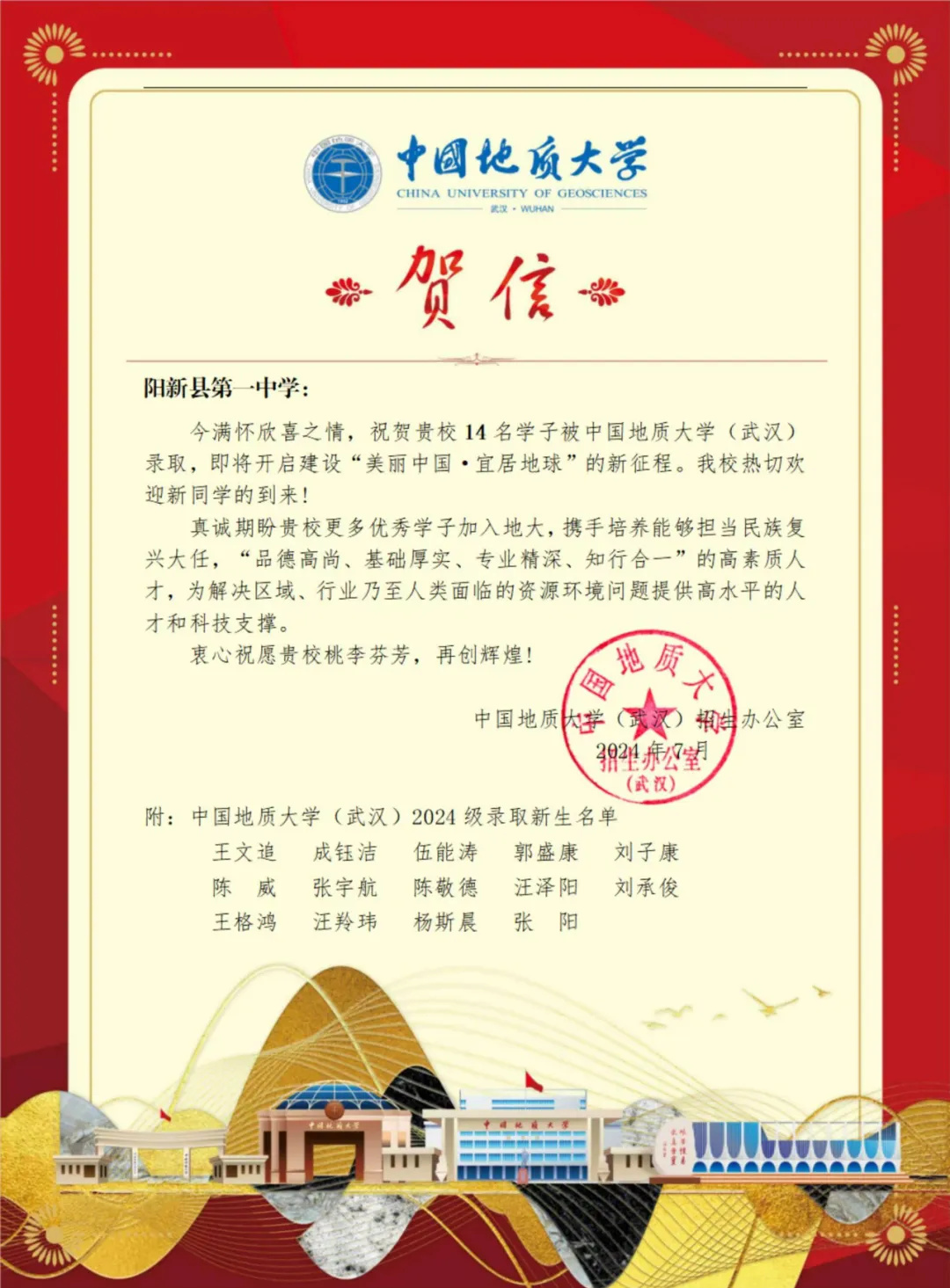 期待录取学子秉承阳新一中“立德、尚志、笃学、创新”的校训,发扬“爱国好学、奋发自强、团结拼搏、勇争第一”的一中精神,在未来的学习生活中不负韶华,砥砺前行!