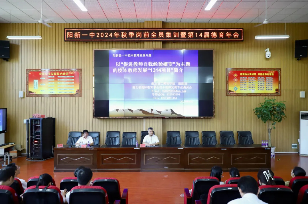 培根铸魂启新程,励志笃行展宏图。为进一步加强教师队伍建设,传承优秀育人经验,创新育人方式方法,2024年8月30日上午,阳新一中在明德楼报告厅召开2024年秋季岗前全员集训暨第14届德育年会。特邀嘉宾有湖北第二师范学院正高级教师潘海燕,武汉市新洲区教师培训中心正高级教师杜新红。全体一中人参加会议,会议由校委委员焦龙河主持。