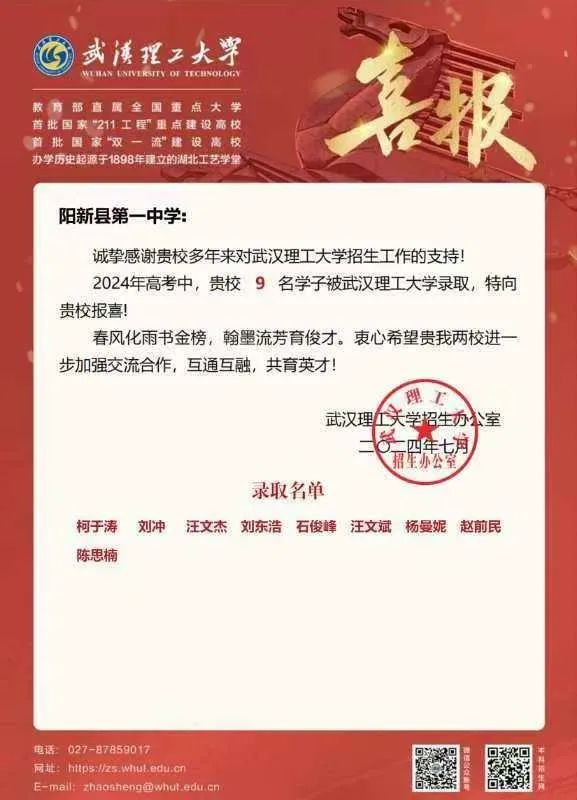 武汉理工大学向我校发来喜报!热烈祝贺柯于涛等9名同学金榜题名!