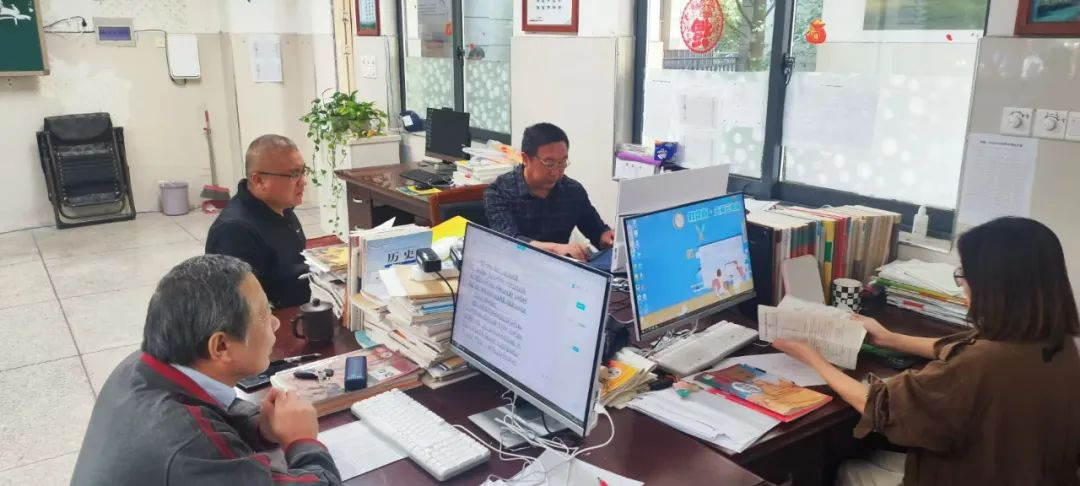 课后,在高三历史组办公室进行评课和研讨。徐国栋老师就石教德老师的课作点评,对高三历史复习备考计划和具体做法提备考建议,希望一轮复习做到选必修教材融合,注重对教材的拓展,提升学生的学科思维。