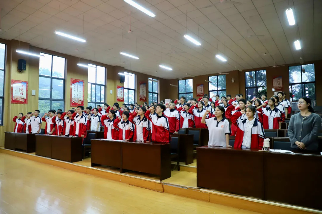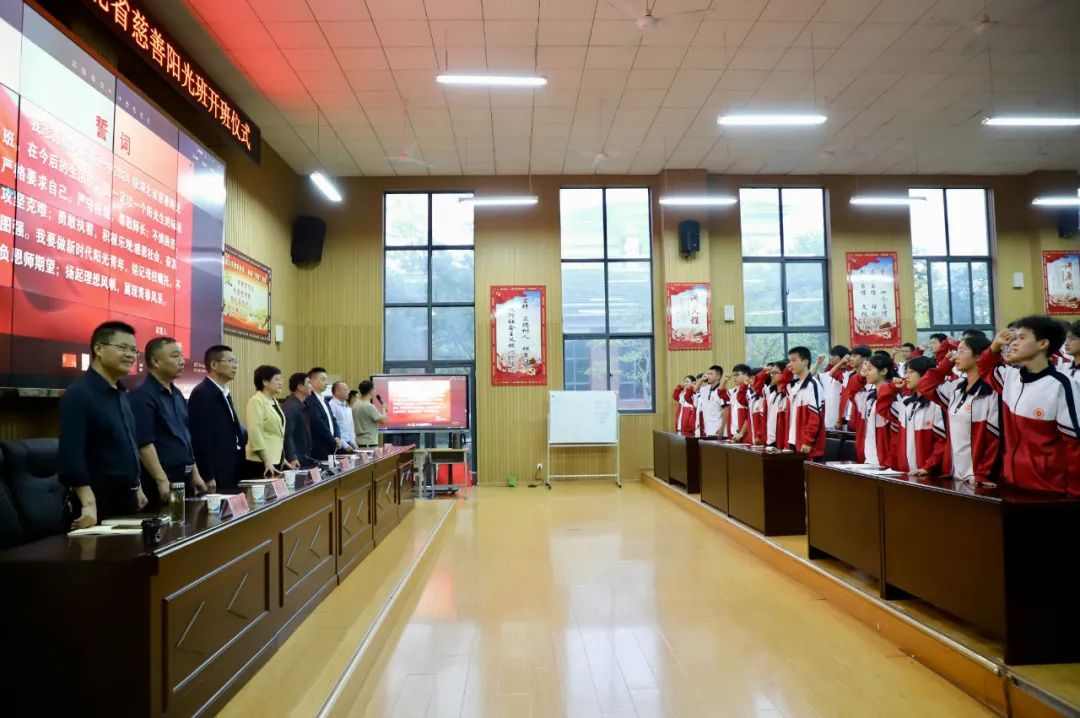 “阳光班”班主任及学生共同宣誓,声音铿锵有力,信念坚如磐石,立志刻苦学习,追求知识的广阔海洋。