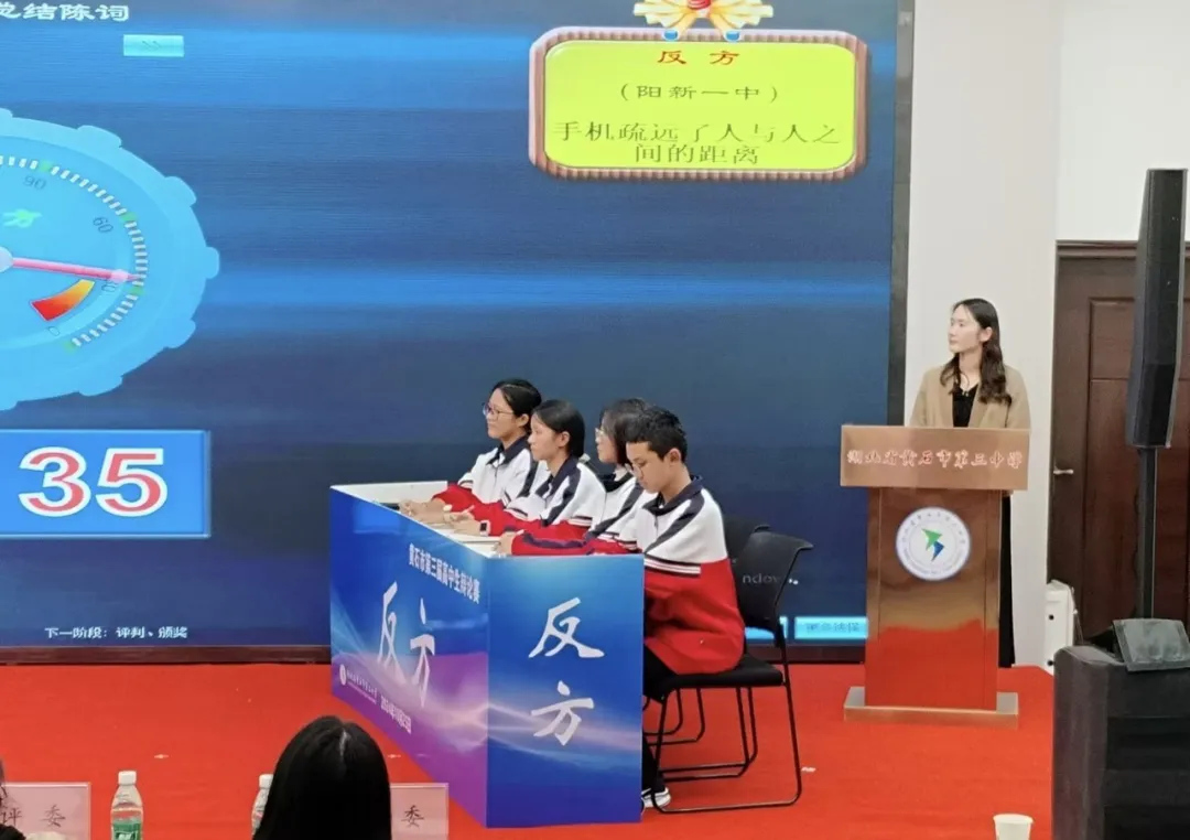 阳新一中和黄石六中的对垒围绕“手机拉近了还是疏远了人与人之间的距离”的辩题展开。赛场上,我校四位辩手时而引经据典,时而旁敲侧击,时而巧妙设问,时而针锋相对,现场充满浓浓的“火药味”。在你来我往的“交锋”中,双方的辩论赢得现场观众掌声不断。