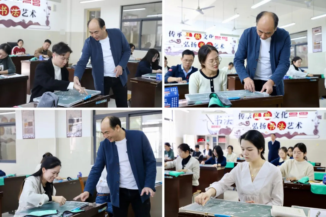 “纸上得来终觉浅,绝知此事要躬行。”在余老师的精彩讲解后,教师们纷纷拿起粉笔开始练习。余老师穿梭于学员之间,对他们的作品进行了耐心而细致的指导。在余老师的悉心点拨下,青年教师们不仅将理论知识内化于心,更通过实操练习将书法之美外化于形,深刻领略到了粉笔字的独特魅力与书写的无穷奥秘。