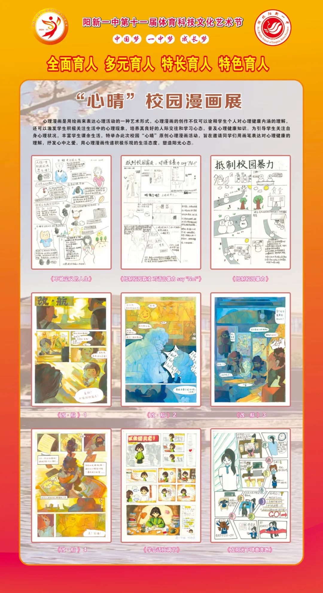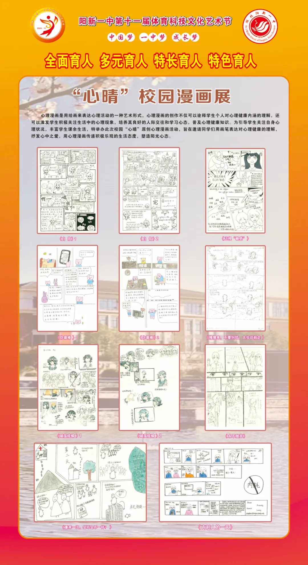 阳新一中第十一届体育科技文化艺术节期间,阳光心理课程中心举办了第三届“心晴”原创心理漫画比赛,旨在通过艺术创作的形式,提高同学们对心理健康的关注和认识。在比赛的筹备阶段,阳光心理课程中心的老师们积极宣传,鼓励学生们以漫画的形式表达自己对心理健康的理解和感悟。