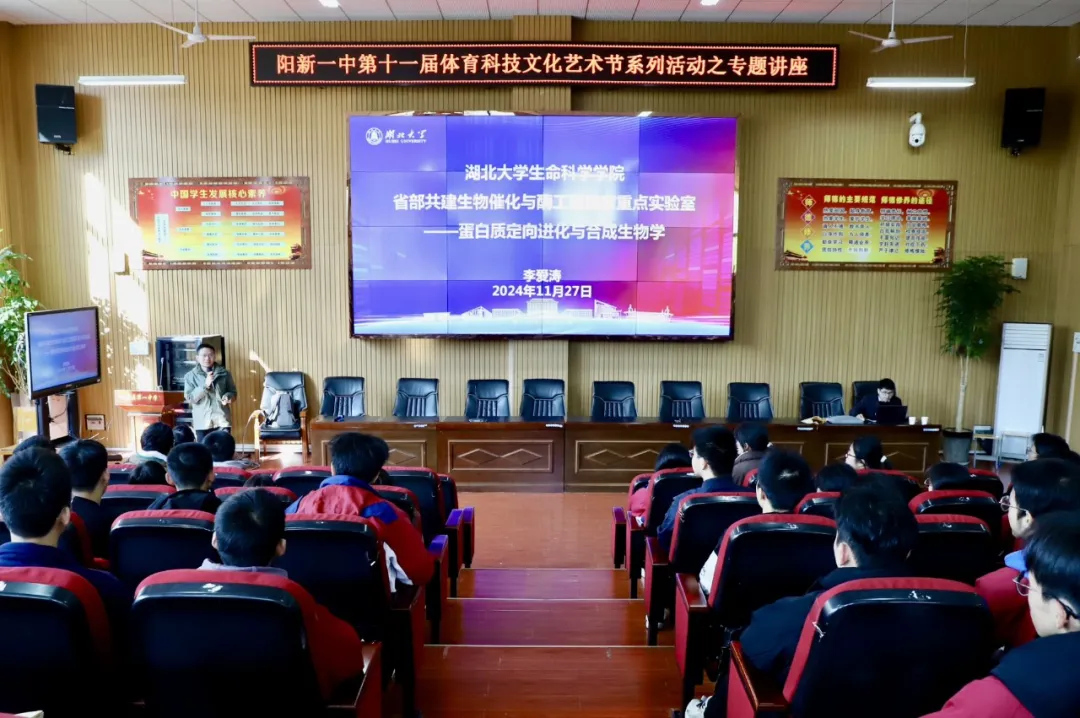2024年11月27日14时10分,湖北大学教授、博士生导师李爱涛在阳新一中明道楼报告厅,为高三年级部分学生上了一堂《合成生物学与蛋白质工程》的科普讲座。