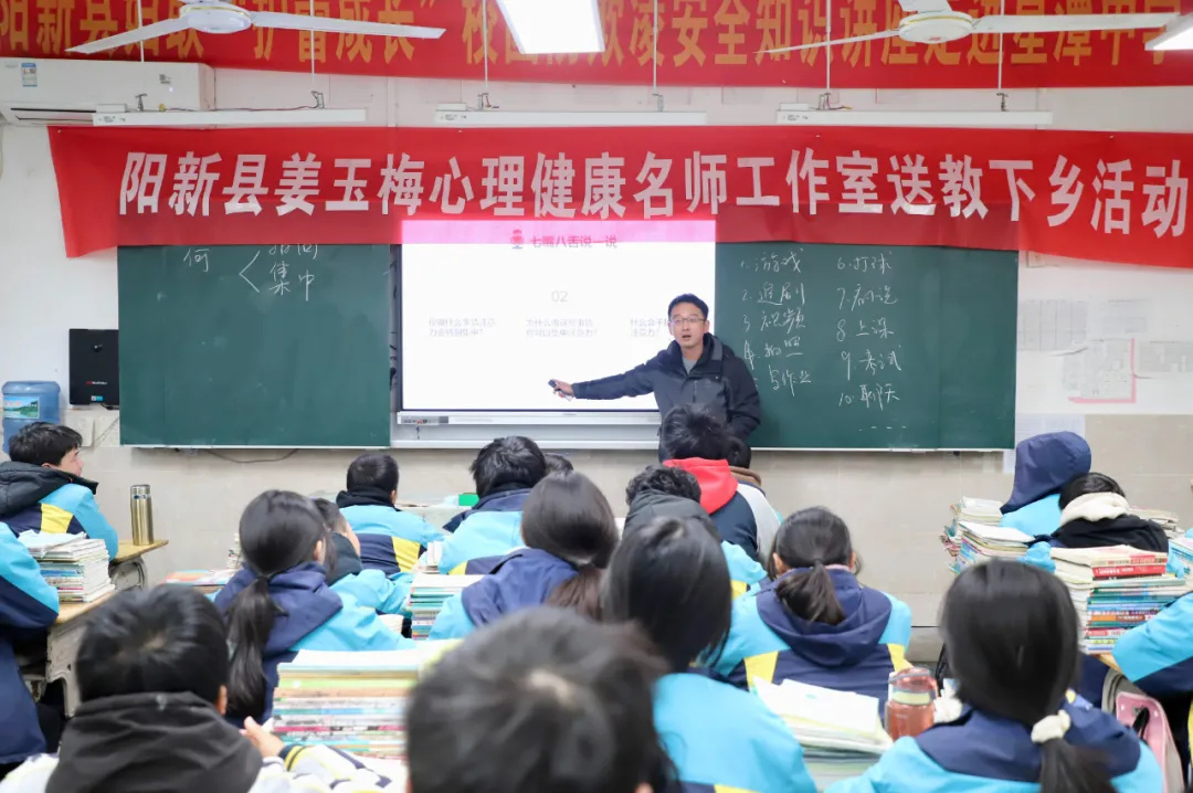 2024年12月25日,阳新县姜玉梅名师工作室送教星潭中学,针对中学生面临注意力难以集中,容易被分散等特点,工作室成员何育龙老师精心设计,为8年级(2)班的同学们开展了一堂深入浅出、气氛融洽的心理健康课,主题为《注意力的奥秘》。教科院领导、工作室主持人姜玉梅、成员罗诗雨、星潭中学心理健康负责人骆老师、柯老师共同听课。