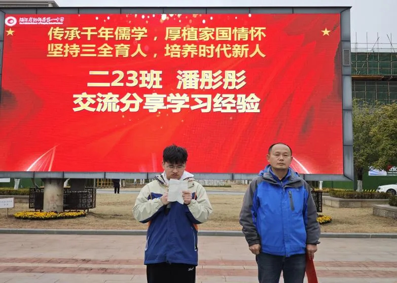 学习有方法,进步无止境。在开学收心检测中勇夺第一名的高二(23)班潘彤彤进步喜人,上台作学习经验分享: