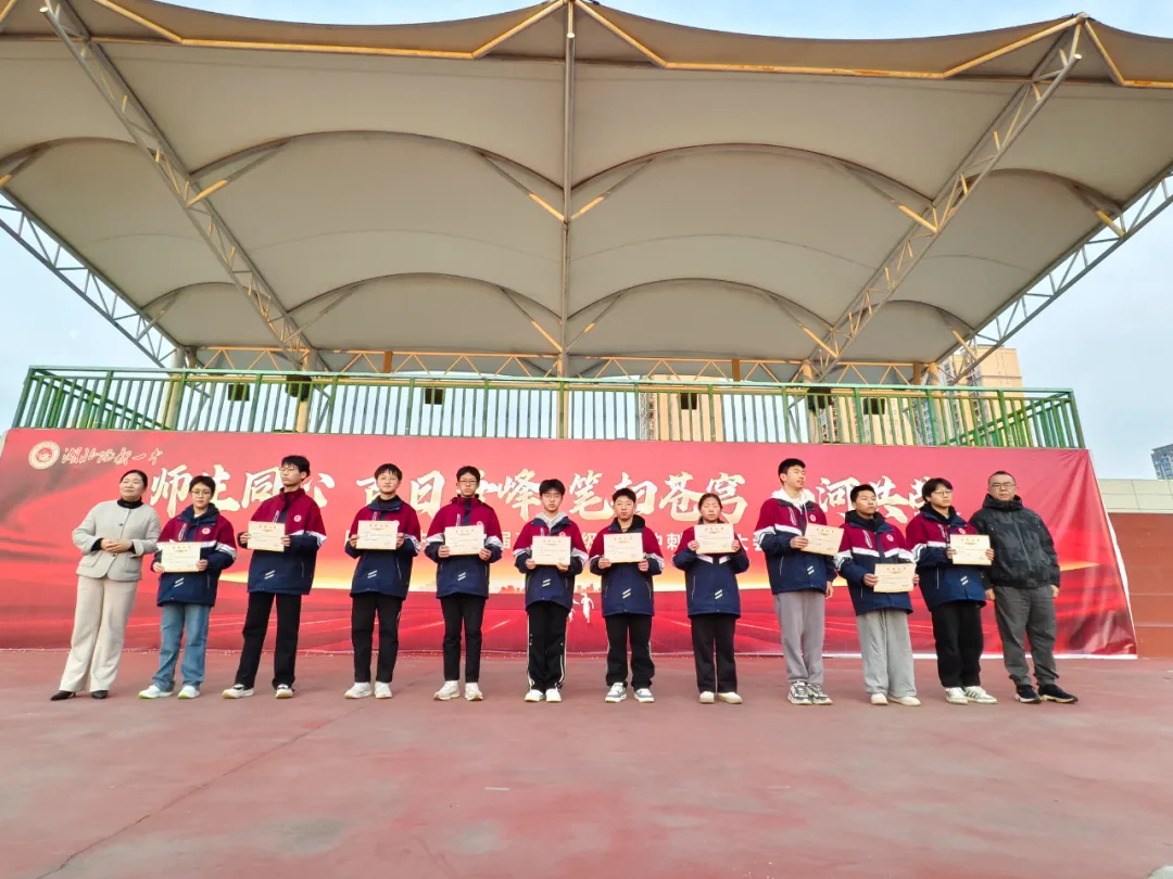 表彰先进,树立典范。舒长华副主任宣读高三年级3月八市联考及九年级清北班3月月考获奖名单,主要包括物理方向前三十名、历史方向前十名、各班第一名、单科第一名。徐美姝副校长与年级组团队共同为获奖学生颁发荣誉证书。这份荣誉既是汗水浇铸的里程碑,更是继续勇攀高峰的新起点。