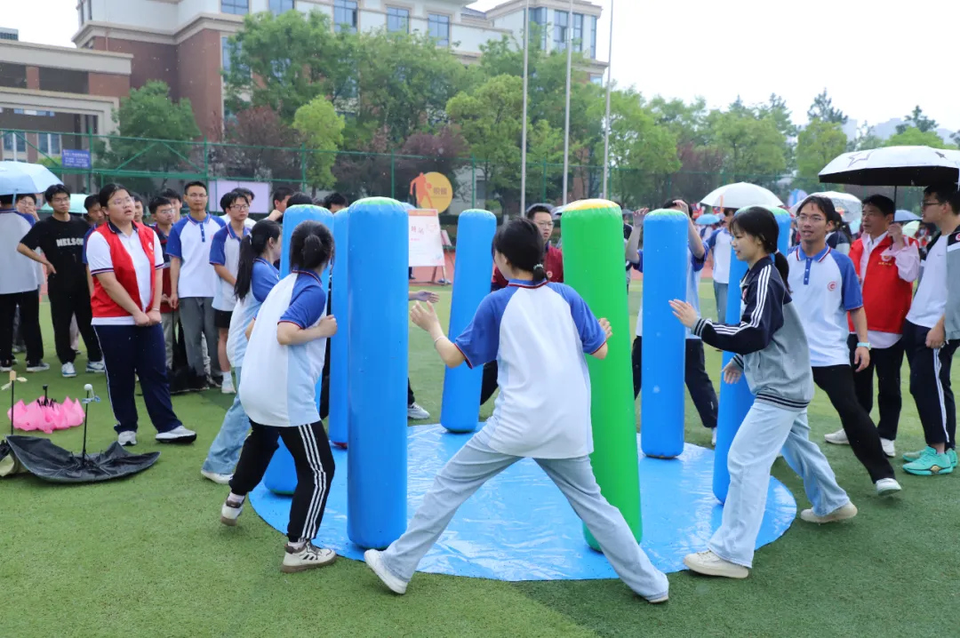 团队支持站中,“不倒森林”要求8人同步移动竹竿,失误时的包容与鼓励,让学生懂得“跟紧集体节奏”比追求完美更重要;“众星捧月”里,小组合力颠球,球的轨迹起伏如同考试中的未知变量,教会大家以灵活心态接纳变化。