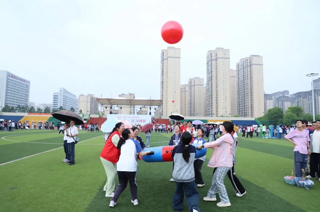 压力释放场成为欢乐的海洋:“毛毛虫竞速”中,10人同骑充气“毛毛虫”喊着口号狂奔,滑稽的造型让“优等生包袱”瞬间瓦解;“压力挣脱赛”里,学生奋力甩动缠绕身体的布条,如同挣脱焦虑的束缚,肢体的释放带动情绪的宣泄。