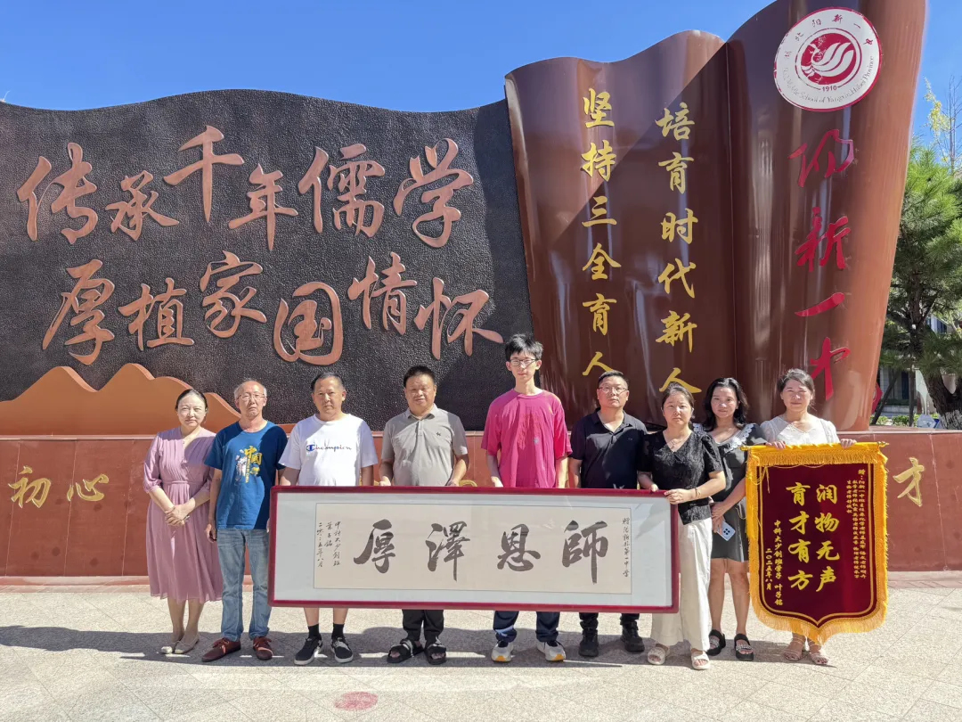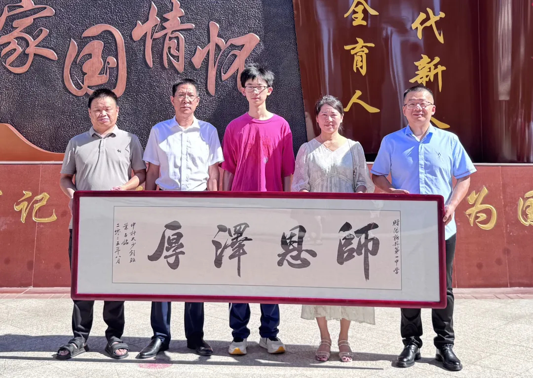 8月15日上午,在2025年高考中考取中科大少年创新班的高二学子叶子铭在家长陪同下重返母校,将写着“师恩泽厚”的牌匾赠予学校,以此感谢学校培育之恩。阳新一中党委书记方长风、副校长刘杰、班主任姜友军及任课教师团队共同见证这一温情时刻。