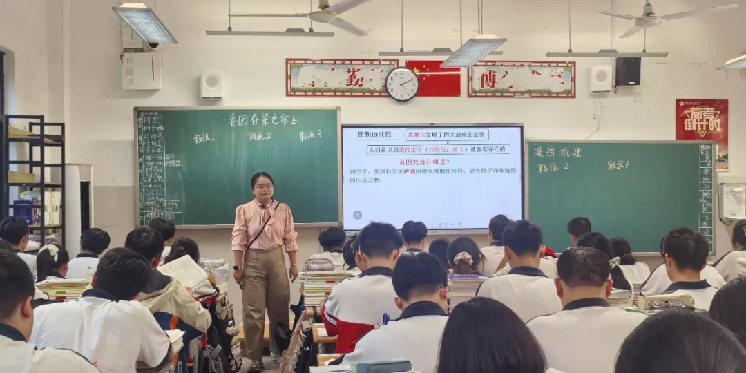 高三生物组陈欣雨老师以《基因在染色体上》为课题主讲一轮复习课,副校长徐宏斌、县教科院生物教研员宋仕豪参与听评课活动。教研员宋仕豪强调,本节课亮点在于对学生思维能力的系统培养——通过对摩尔根实验层层推进的解析,引导学生经历从现象观察、假说提出到验证推理的完整科学探究过程,充分调动了学生的学习能动性。