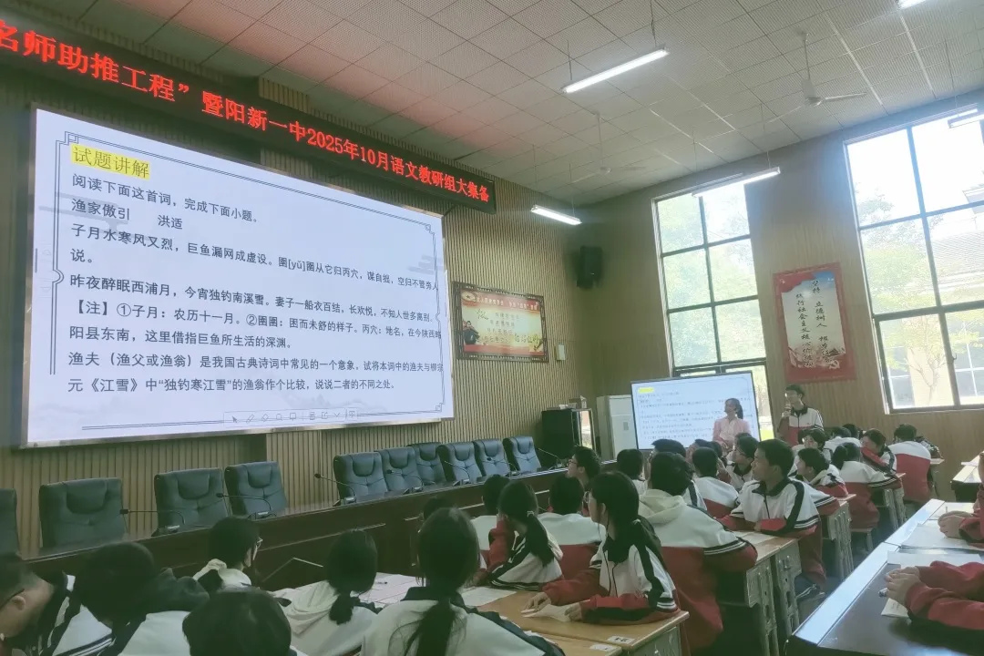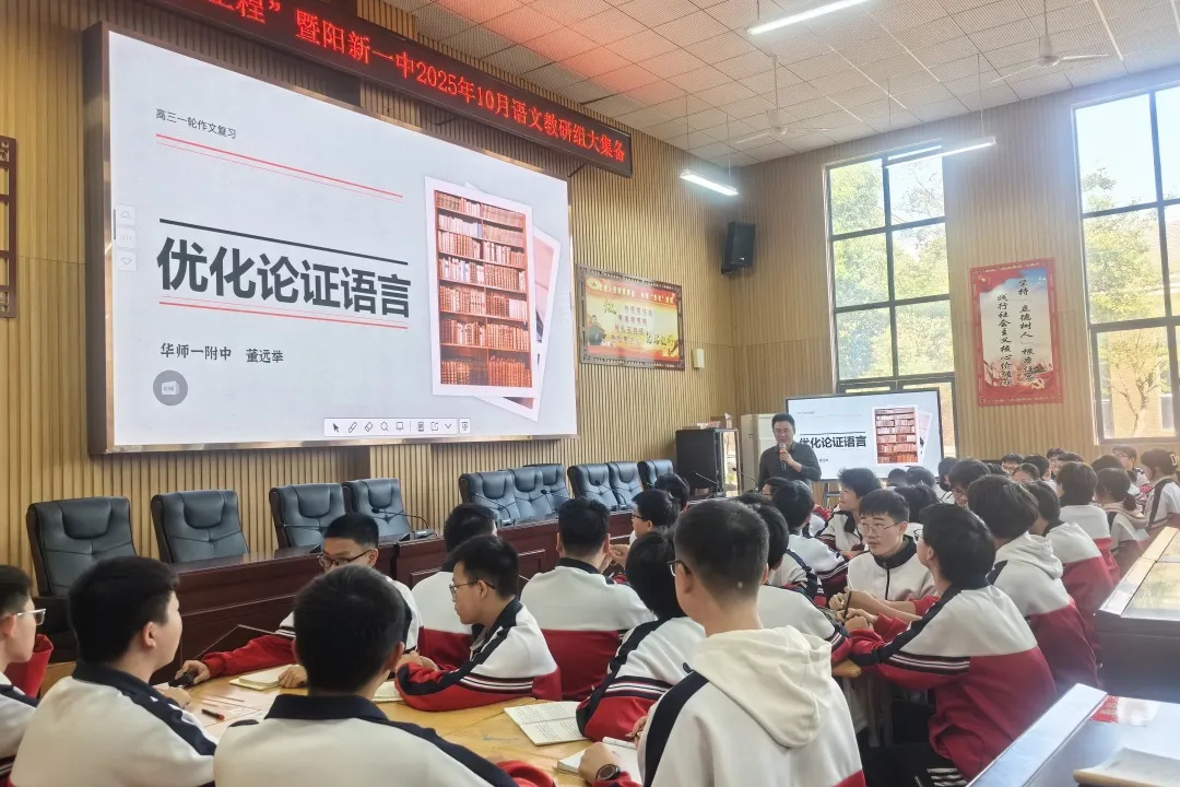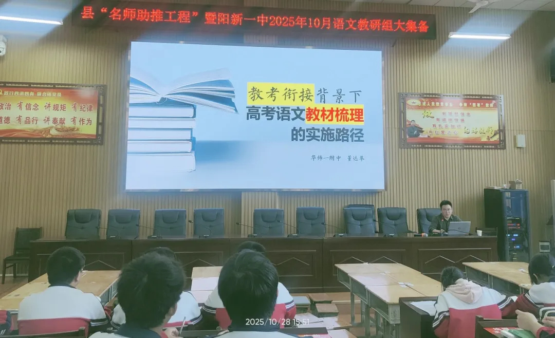 为精准赋能2026届高三语文一轮复习,破解教考衔接重点、难点,辐射高一、高二语文常规教学,10月28日下午,我校在明道楼报告厅开展县“名师助推工程”暨10月语文教研组大集备活动。华师一附中专家董远举老师讲授示范课,校党委书记方长风,县教科院语文教研员王敏,校党委委员、副校长刘杰及语文组全体教师、县内兄弟高中语文教师代表参加活动。活动由语文教研组组长熊玉梅主持。