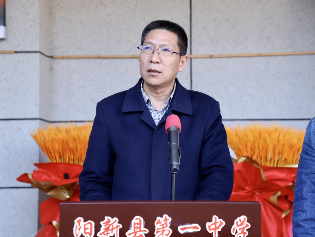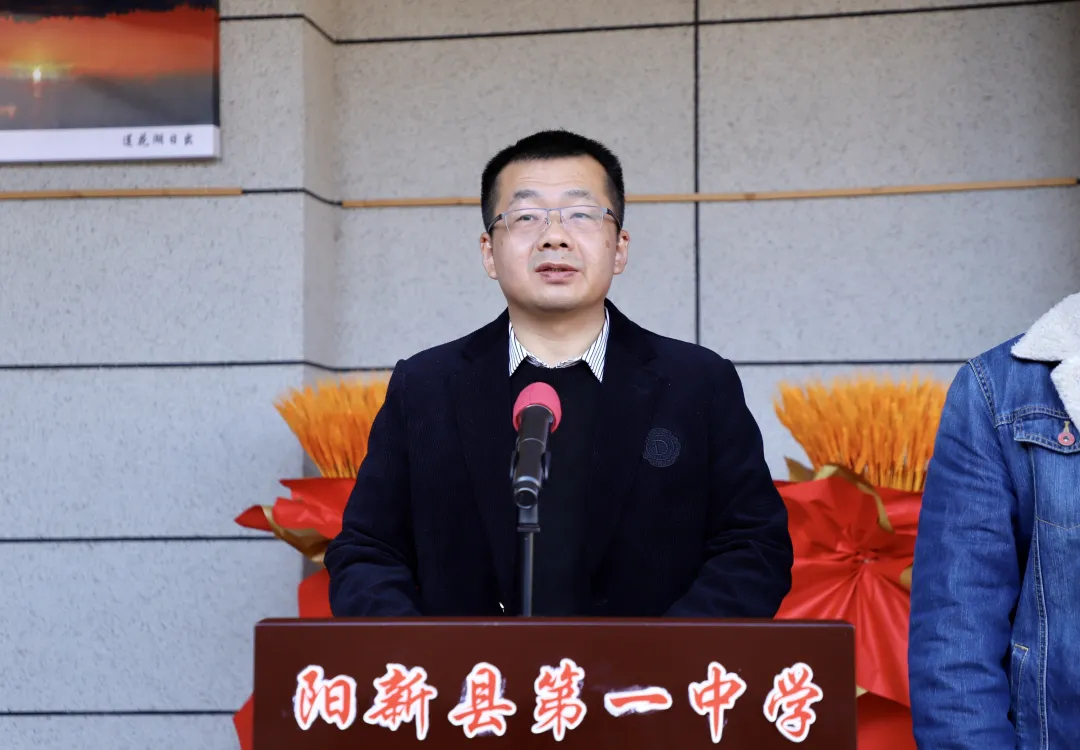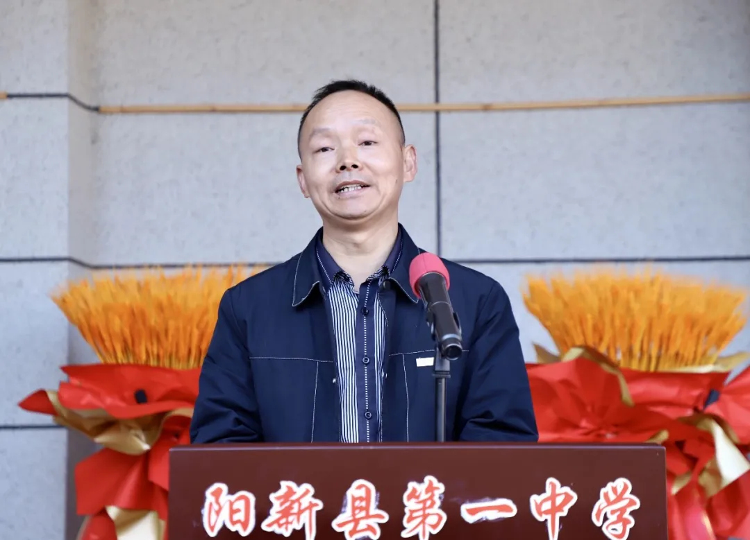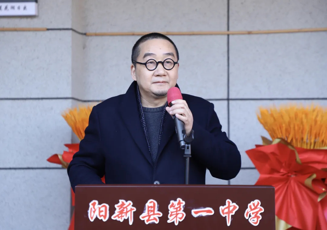 校党委委员、副校长刘杰致欢迎词。他对各位领导、嘉宾及师生的到来表示热烈欢迎,并对为画展付出辛勤努力的青年画家马先文老师、艺术策划者及所有支持校园文化建设的各界朋友致以诚挚感谢。他在致辞中指出,阳新古称“楚头吴尾”,吴山楚水承载着深厚的地域文脉,本次画展是阳新一中首次举办大型国画艺术展,既是师生认识家乡、增进乡土情感的良机,也是学校美育实践与校园文化建设的重要里程碑。