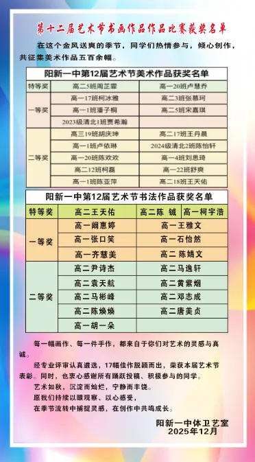 我校第十二届体育科技文化艺术节的美术篇章已落幕,但同学们对艺术的热爱与追求永不止步。让我们珍藏这份秋日里的美好记忆,持续在日常学习生活中发掘灵感、陶冶情操。我们期待,在下一届艺术节的舞台上,能看到更多同学闪耀的身影,遇见更多打动人心的精彩作品!