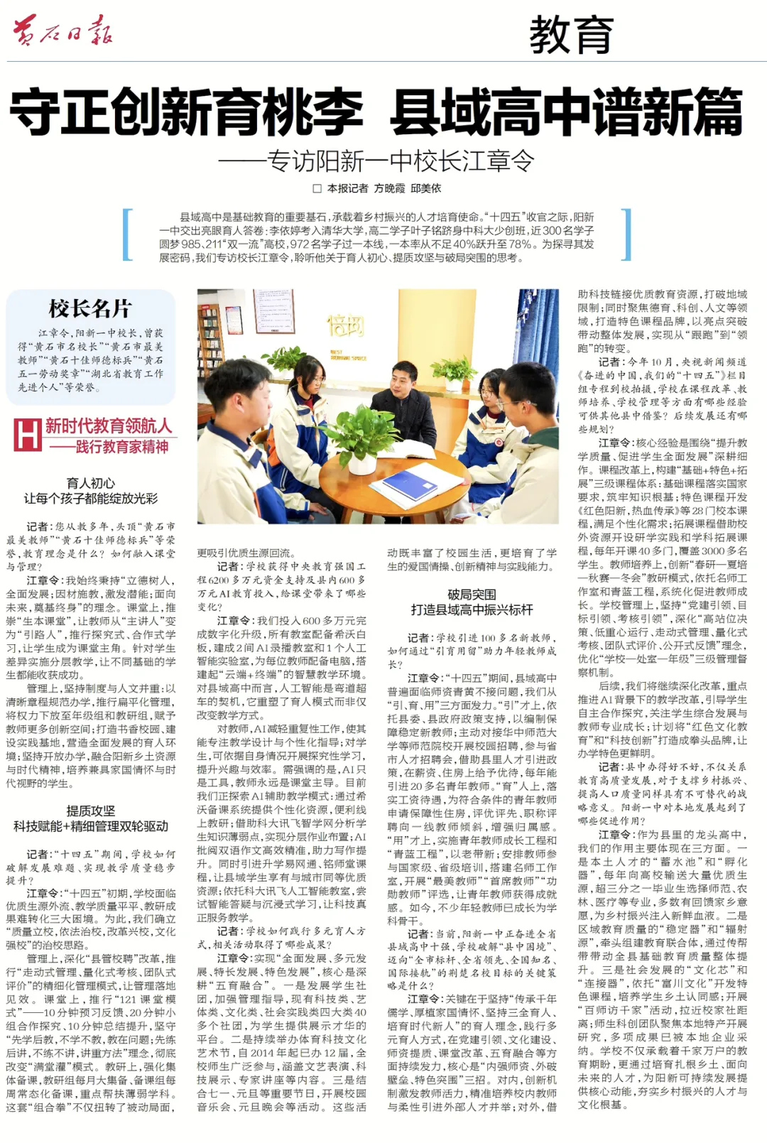 近日,黄石日报以《守正创新育桃李 县域高中谱新篇》为题,专访我校党委副书记、校长江章令,深入报道我校在“十四五”期间取得的育人成果与办学成就。江校长作为“黄石市名校长”“黄石市最美教师”“黄石十佳师德标兵”“黄石五一劳动奖章”“湖北省教育工作先进个人”等多项荣誉获得者,分享了他对教育初心、质量提升与学校发展的思考与实践。