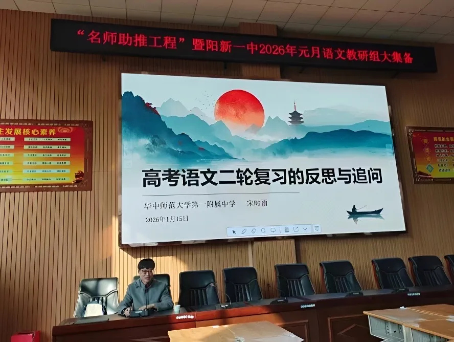 为精准对接新课标要求,切实推动教学理念向课堂实践深度转化,全面提升高三年级备考质效,1月15日下午,我校语文教研组在明德楼学术报告厅开展元月大集备活动。华师一附中语文教学名师宋时雨老师亲临指导,我校党委委员、副校长刘杰及全体语文教师、县域内兄弟学校教师代表参加活动。