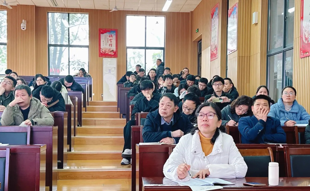 1月16日下午,我校数学教研组在明道楼报告厅开展元月大集备活动,特邀武汉十一中周少雄老师亲临指导,我校数学组蹲点校领导潘龙星及全体数学教师、县域内兄弟学校数学教师代表参与活动。活动由数学教研组长汪梅花主持。