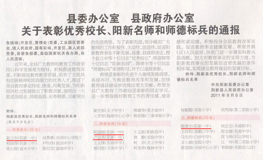 9月9日,从“阳新县教育工作会议暨第27个教师节庆祝大会”获悉,我校校长赵立中荣获阳新县“优秀校长”称号,副校长、副书记明道树、生物教师卢忠典荣获“阳新名师”称号,教科室主任陈绪全荣获阳新县“师德标兵”称号,是本次活动获奖人数最多的单位。以下来自《黄石日报》刊登的通报。