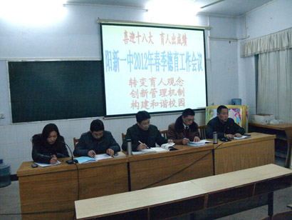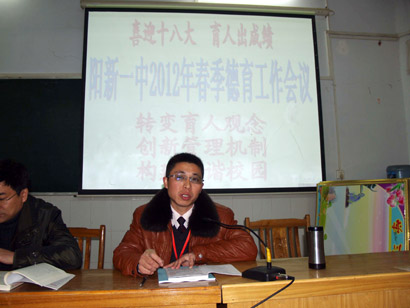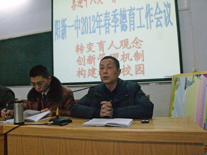 会议由团委书记徐美姝主持。会上,政教室主任邓家宜解读了《阳新一中2011—2012学年度下学期德育工作计划》,政教室副主任石章权针对今年德育工作的新举措——“文明班级”评比做了详细说明,政教室副主任秦青山借用省“班主任培训”中专家的一些理论结合教师工作实际与大家探讨“如何做一名