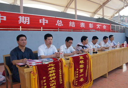 大会在庄严的国歌声中拉开序幕。会上,政教处副主任石章权宣读期中总结评比的优秀干部、三好学生和积极分子名单;教务处副主任王义付和工会主席肖绪曙分别宣读高一、高二年级的期中考试优秀学生名单;校办副主任李雁鸣,校党办副主任韦正雄分别宣读高一、高二年级的春季球类运动会获奖名单。