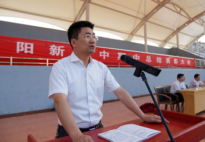 最后,副校长明道树做了总结性讲话。他首先向获奖的同学和班级表示热烈的祝贺,向所有为学生的成长、进步而勤奋耕耘、默默奉献的教师表示衷心感谢。他还对全体学生提出了几点希望,希望同学们要学会学习、学会做人、学会关心、学会感恩,珍惜美好光阴,抓住现在,努力学习。牢固树立天下兴,我的责任;学校兴,我的责任;班级兴,我的责任的责任意识。他结合时事,鼓励大家树立远大理想,以振兴中华为己任,将理想和信念落实到每天的学习中去,号召大家借期中考试的东风,认真总结经验教训,发扬成绩,争取下半学期各方面取得更大的进步。
