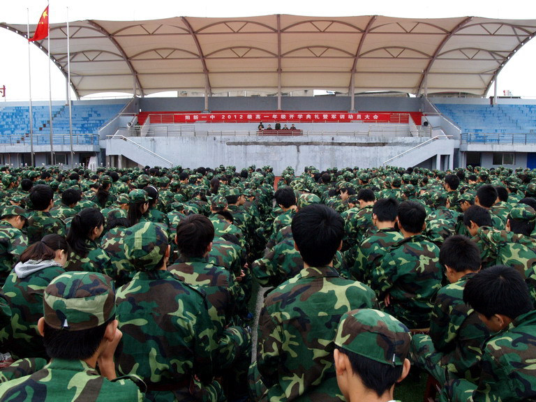 9月13日 ,秋雨蒙蒙,凉风习习。阳新一中2012级高一年级开学典礼暨军训动员大会在学校塑胶运动场举行。阳新一中副校长梁师稳、李永红,工会主席肖绪曙,政教处主任邓家宜,高一年级主任李朝忠,阳新顺溜训练中心金教官出席动员大会,并在主席台就座。大会由校工会主席肖绪曙主持。