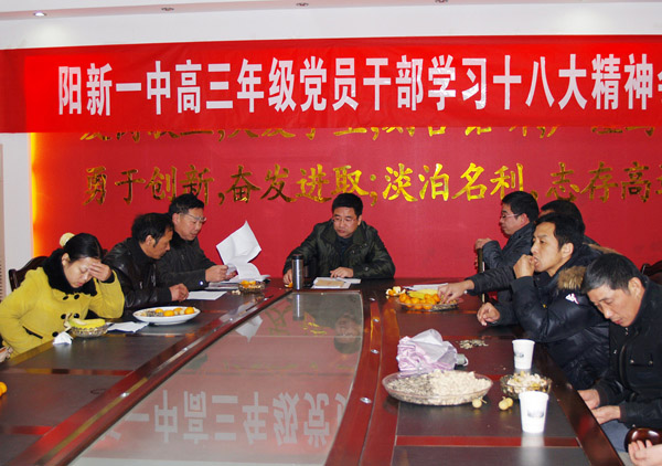 1210晚上7点,高三年级(2)全体党员干部教师学习十八大精神会议在综合楼三楼会议室举行。