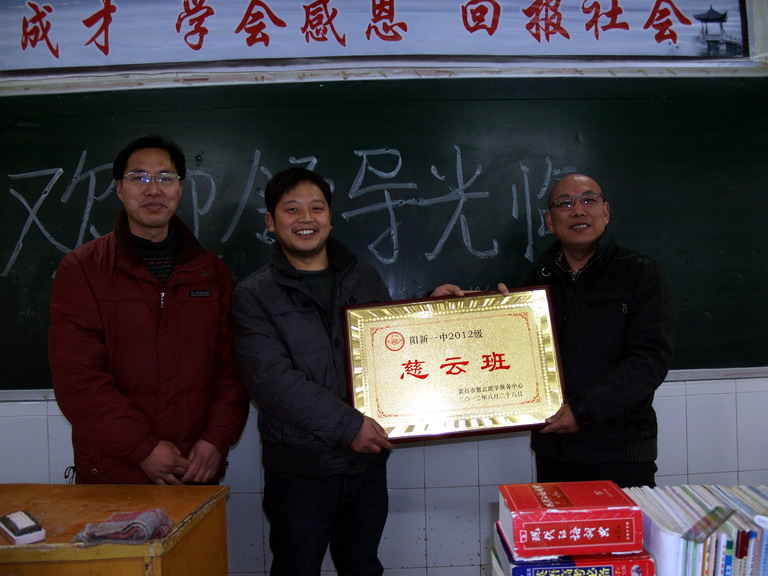 1月30 日 ,阳新一中2012级“慈云班”授牌典礼在高一(16)班教室举行。黄石市慈云助学服务中心刘昌明主任,阳新慈善总会办公室陈瑞芝主任,阳新一中梁师稳副校长,阳新一中慈善助学办公室周升发主任,高一(16)班班主任尹传仁老师参加了授牌典礼。典礼由阳新一中副校长梁师稳主持。