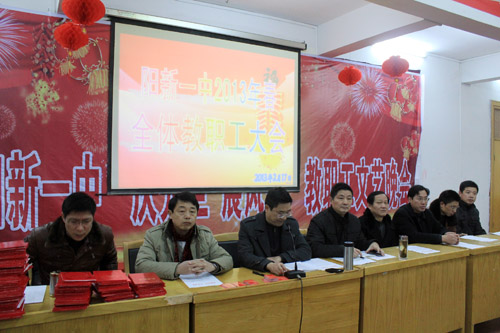 最后,赵立中校长作了2013年新春工作报告。在报告中,赵校长言简意赅地回顾了2012年阳新一中取得的辉煌成绩,并列举了学校在高考备考、常规管理、师资力量、校园建设等方面所做的十件大事;在报告中,赵校长充满激情地展望了2013年阳新一中美好的发展蓝图,并描述了学校在高考备考、招生改革、课程改革、师资培养、校园建设等十个方面的奋斗目标。同时,赵校长号召全体教职员工在十八大精神的鼓舞下,带着2012年胜利的喜悦,努力去创造2013年新的辉煌!