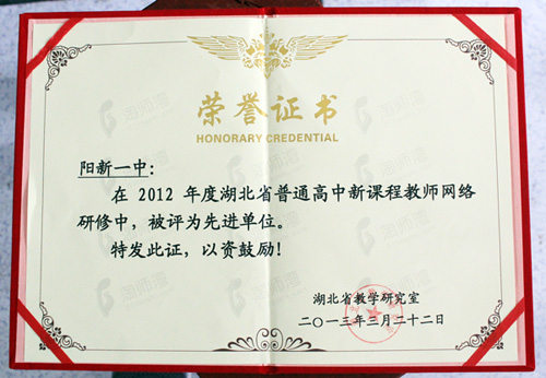 “2012年度湖北省高中教师网络研修先进个人优秀奖”40名 参与次数≥10次