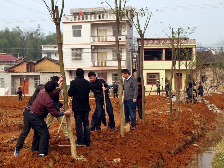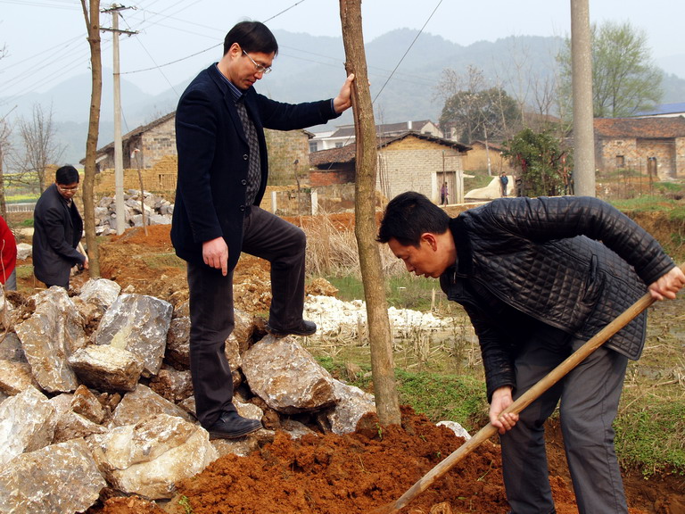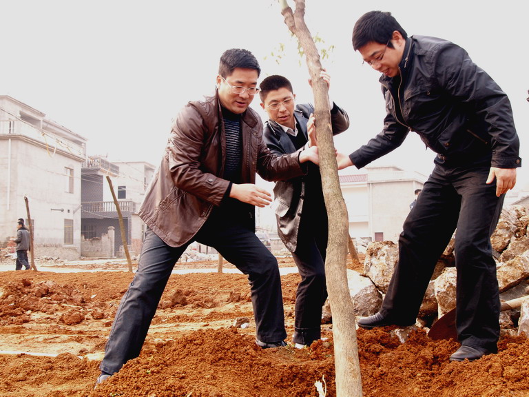 所栽植的40棵香樟树是我校赠送给进中村,算是为该村的环保建设出一份绵薄之力。进中村的村民很是感谢,临行时拿烟表谢意,但都被赵校长婉言谢绝