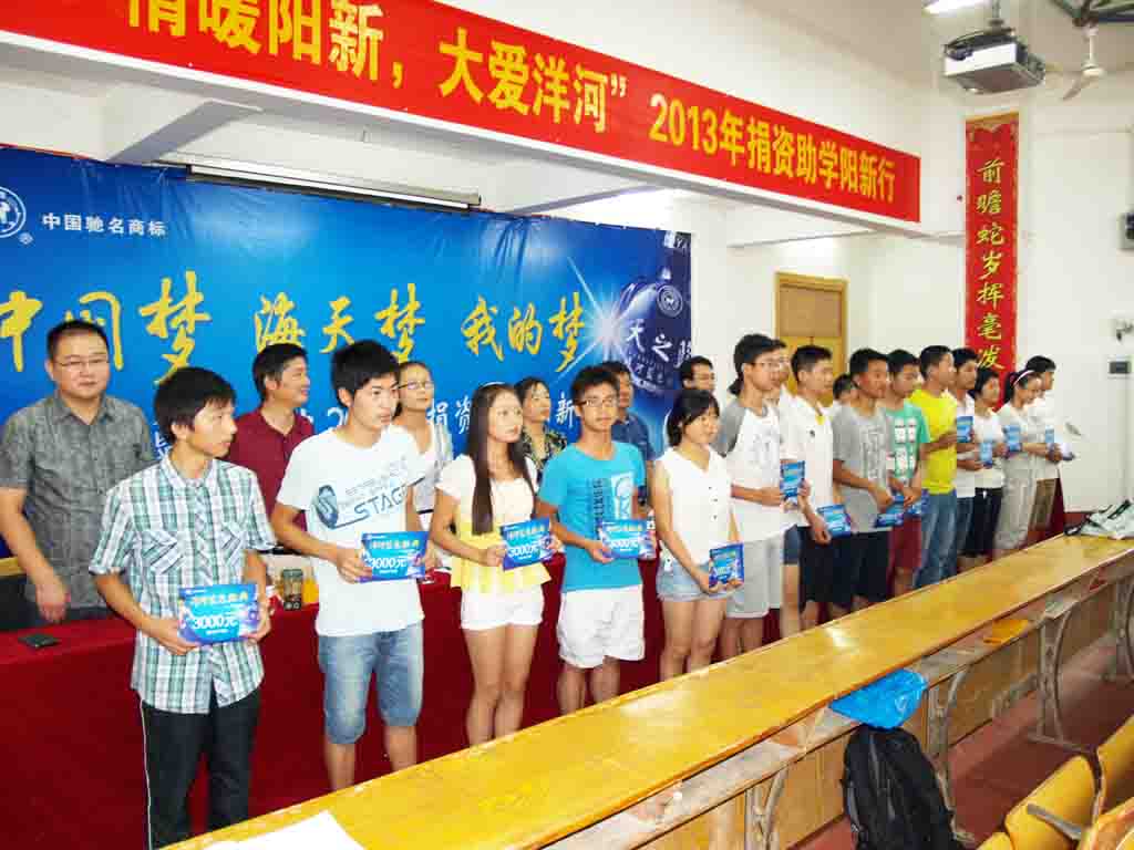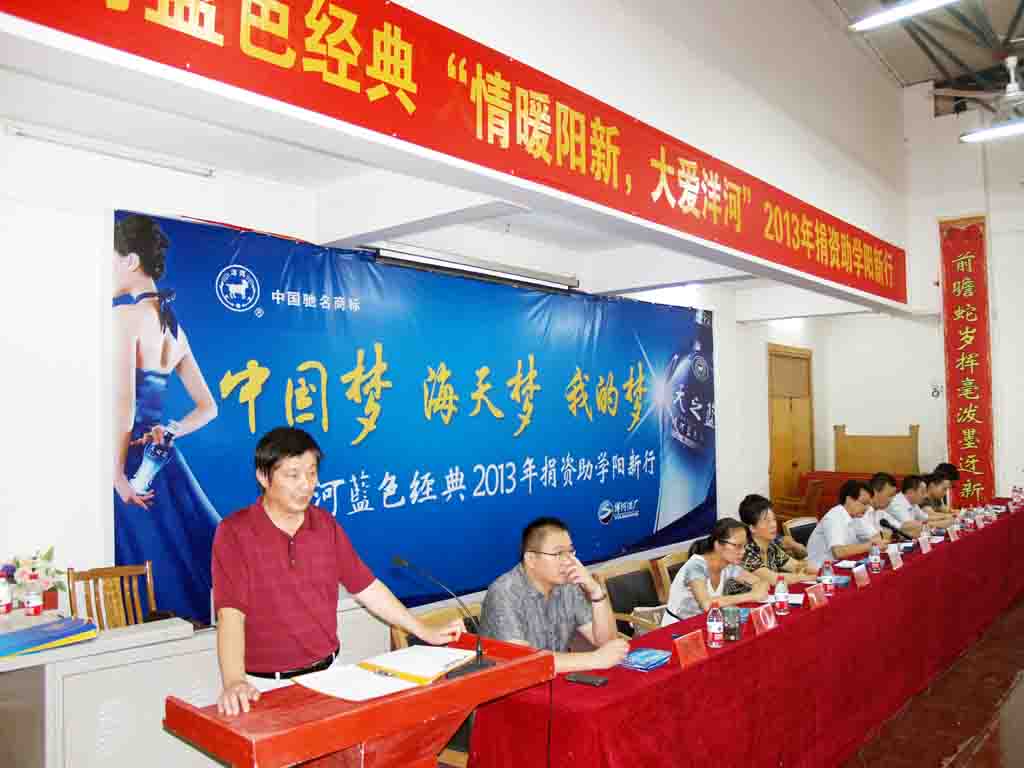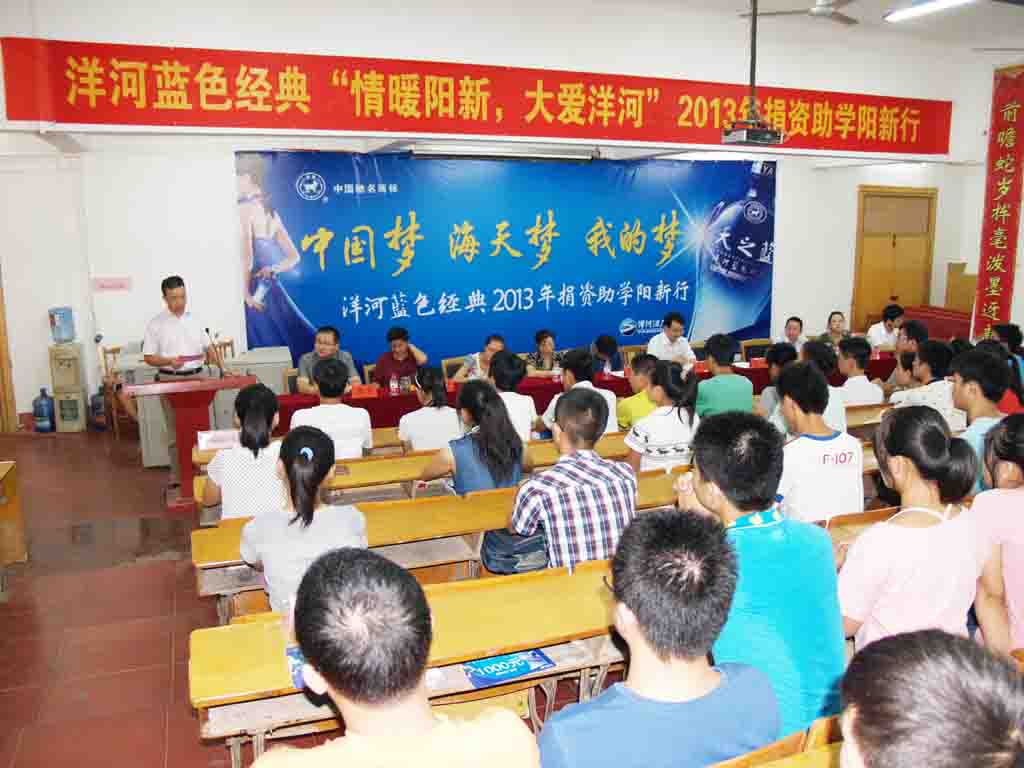 8月19日上午9:30,洋河蓝色经典“情暖阳新,大爱洋河”2013年捐资助学活动在我校阶梯教室举行。此次活动由洋河酒厂出资10万元,共资助了我校50名刚刚考上大学的学生。一等助学金15名,每人3000元;二等助学金20名,每人2000元;一等助学金15名,每人1000元。