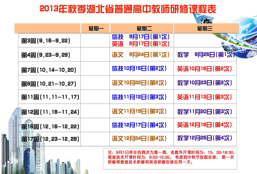 2013年秋季湖北省普通高中教师研修”课程安排已经确定。在高中新课程改革的背景下,网络研修是省教育厅实施教师素质提高工程的重要举措,是教师专业成长的重要途径,请各年级、各学科组根据“课程表”组织教师按规定时间收看。