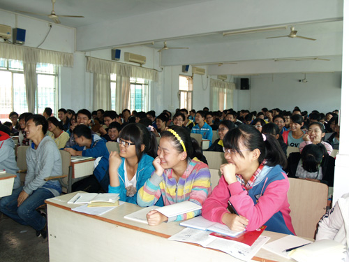 由于学校停电,发电机也故障不断,但晓苏教授依然讲兴很浓,电教室里的学生听得津津有味。有意思的是往往晓苏教授讲到精彩处,话筒就没有声音,这让电教室以外,在教室里听讲座的学生对讲座充满了更多的期待,学生们因话筒失声而表现出的哀声叹气也让讲座变得更有意思。